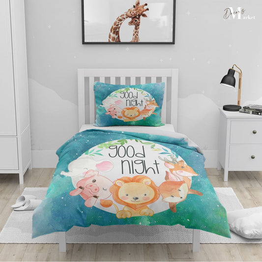 Lion Piggy Friends Duvet Cover Set w Pillow Cover, Green Kids Animal 3D Quilt Cover, Single Double Queen King Size Doona Cover