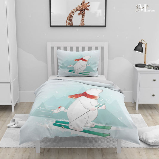 Polar Bear Skiing Duvet Cover Set w Pillow Cover, Green Kids Animal 3D Quilt Cover, Single Double Queen King Size Doona Cover
