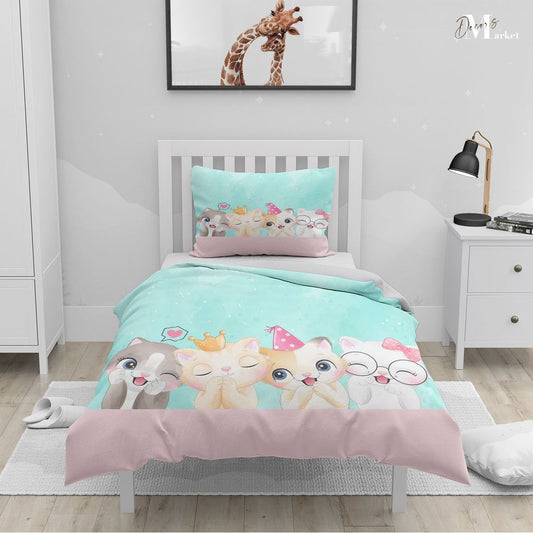 Cat Baby Family Duvet Cover Set w Pillow Cover, Green Kids Cartoon 3D Quilt Cover, Single Double Queen King Size Doona Cover