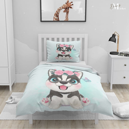 Baby Puppy Dog Duvet Cover Set w Pillow Cover, Green Kids Cartoon 3D Quilt Cover, Single Double Queen King Size Doona Cover