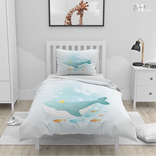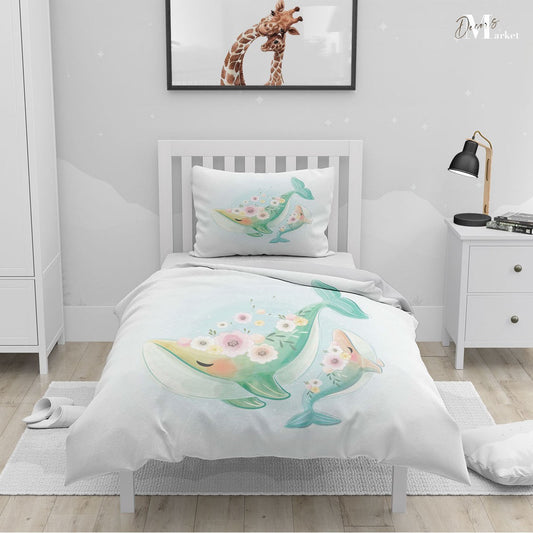 Whale Sleep Family Duvet Cover Set w Pillow Cover, Green Kids Cartoon 3D Quilt Cover, Single Double Queen King Size Doona Cover