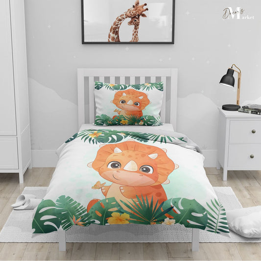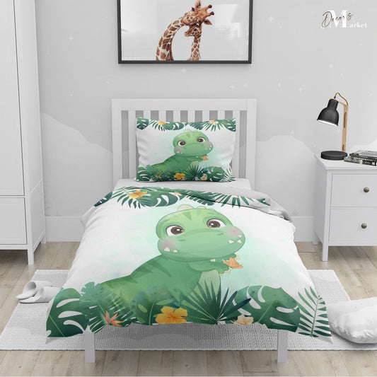 Baby Dinosaur Leaf Duvet Cover Set w Pillow Cover, Green Kids Cartoon 3D Quilt Cover, Single Double Queen King Size Doona Cover