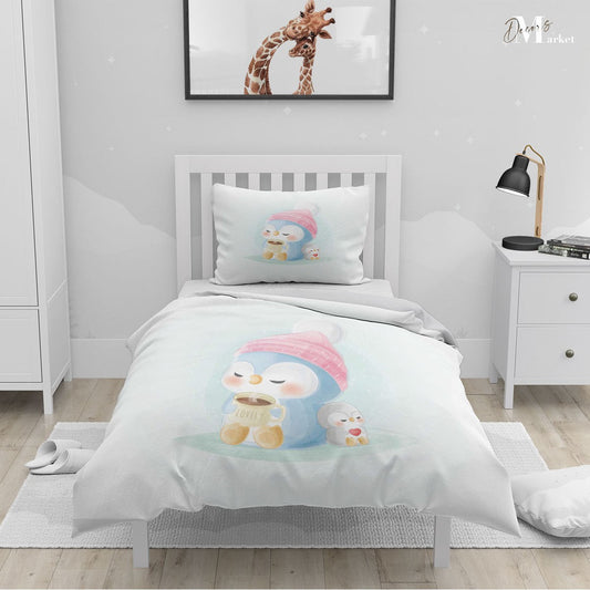 Penguin Family Dream Duvet Cover Set w Pillow Cover, Green Kids Cartoon 3D Quilt Cover, Single Double Queen King Size Doona Cover