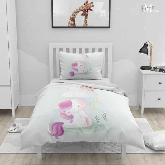 Unicorn Rainbow Dream Duvet Cover Set w Pillow Cover, Green Kids Cartoon 3D Quilt Cover, Single Double Queen King Size Doona Cover