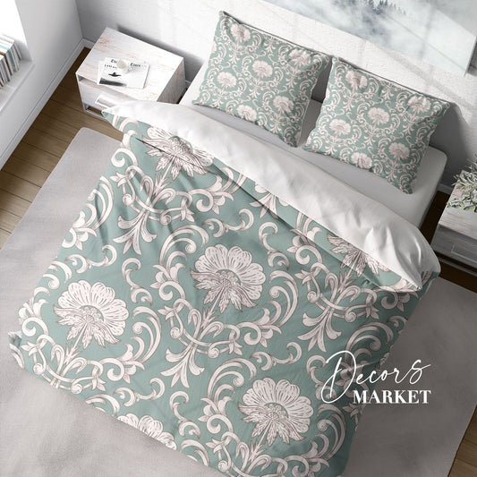 Elegant Damask Duvet Cover Set w Pillowcases, Green Leaves Floral Patterns 3D Quilt Cover, 3pc Single Double Queen King Size Doona Cover