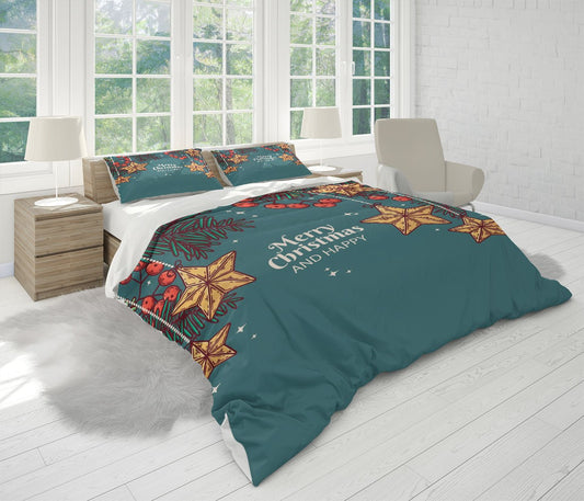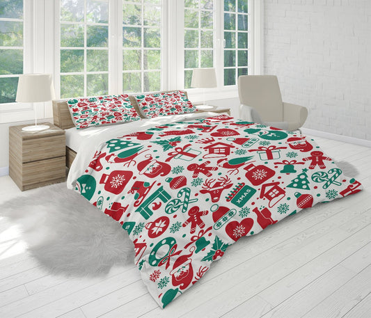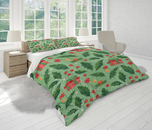 Winter Holiday Icons Duvet Cover Set W Pillowcases, Green Texture Patterns 3D Quilt Cover, 3Pc Single Double Queen King Size Doona Cover