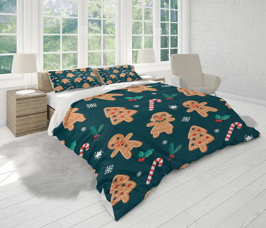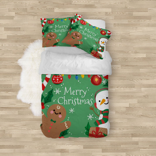 Christmas Gingerbread Man Duvet Cover Set W Pillowcases, Green Texture Patterns 3D Quilt Cover, 3Pc Single Double Queen King Size Doona Cover
