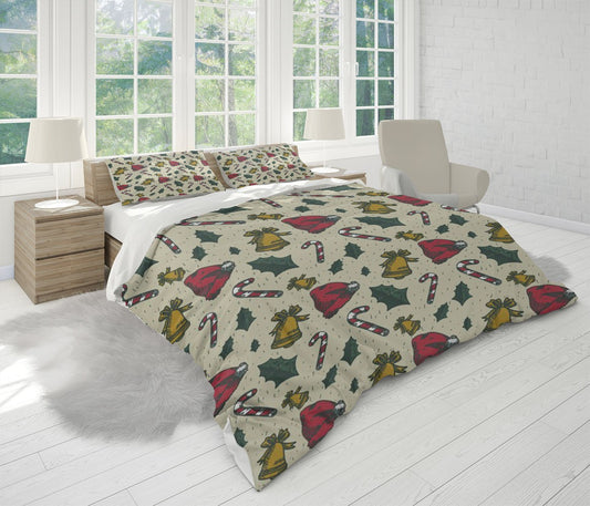 Christmas Hat Bells Duvet Cover Set W Pillowcases, Green Texture Patterns 3D Quilt Cover, 3Pc Single Double Queen King Size Doona Cover