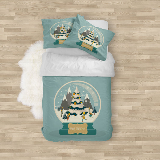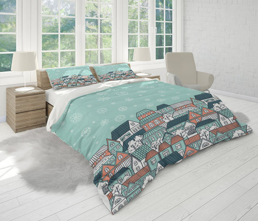 Christmas Snowing Town Duvet Cover Set W Pillowcases, Green Art Pop Art 3D Quilt Cover, 3Pc Single Double Queen King Size Doona Cover