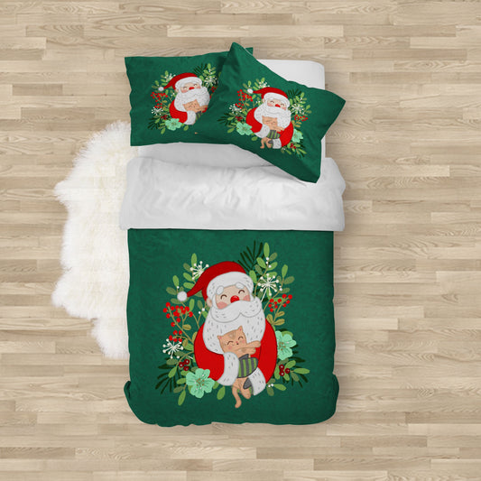 Santa Cat Duvet Cover Set W Pillowcases, Green Kids Cartoon 3D Quilt Cover, 3Pc Single Double Queen King Size Doona Cover