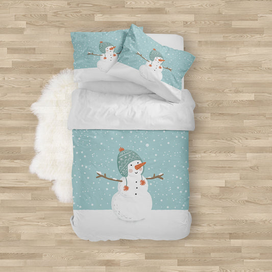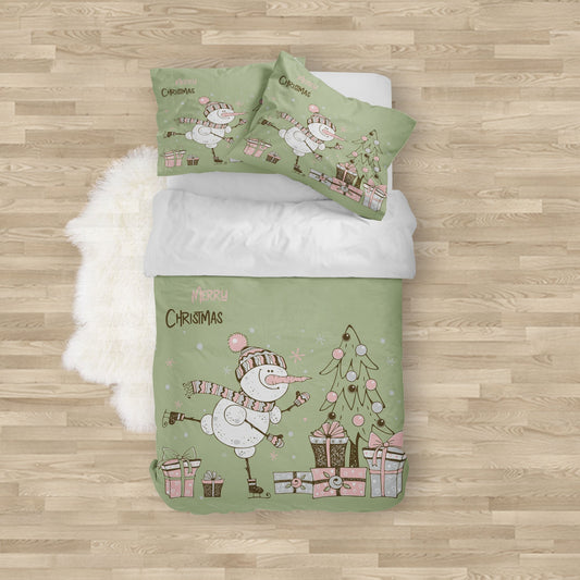 Snowman Christmas Hat Duvet Cover Set W Pillowcases, Green Kids Cartoon 3D Quilt Cover, 3Pc Single Double Queen King Size Doona Cover