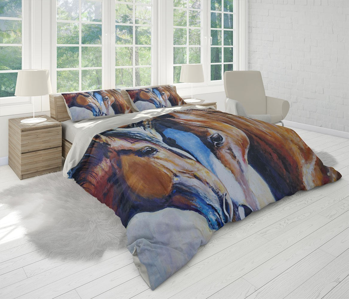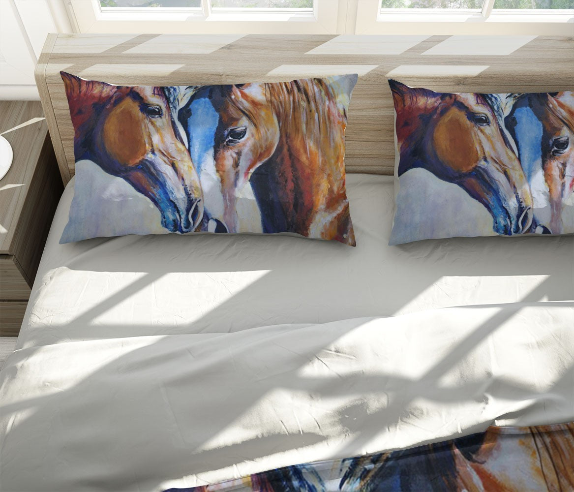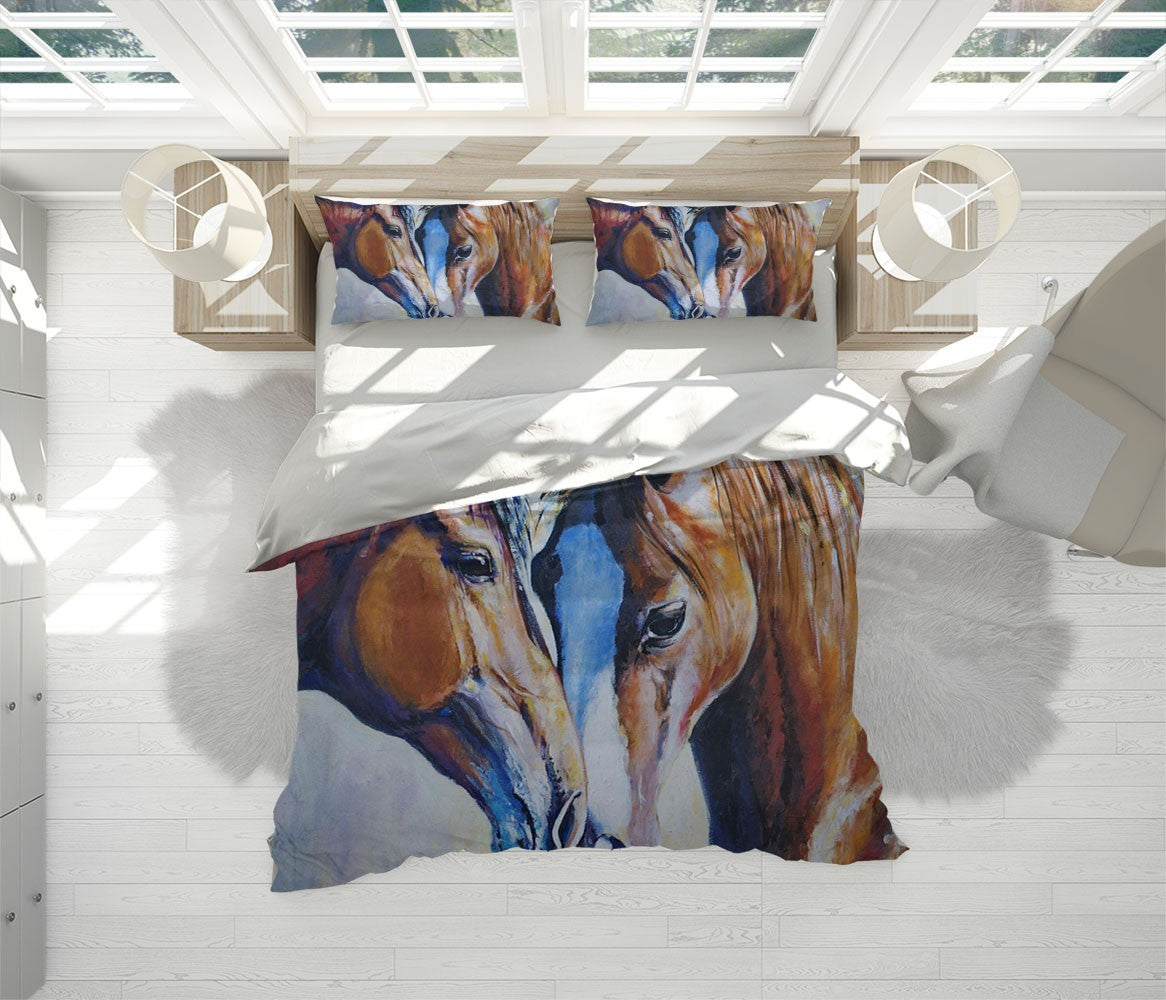 Snuggling Horses Duvet Cover Set W Pillow Cover, Brown Art Traditional 3D Quilt Cover, Single Double Queen King Size Doona Cover