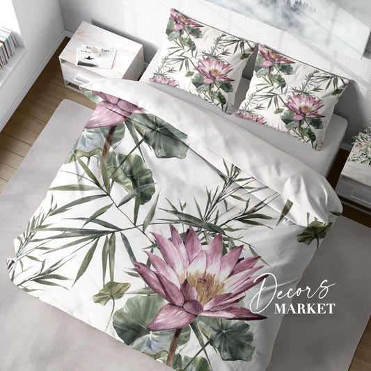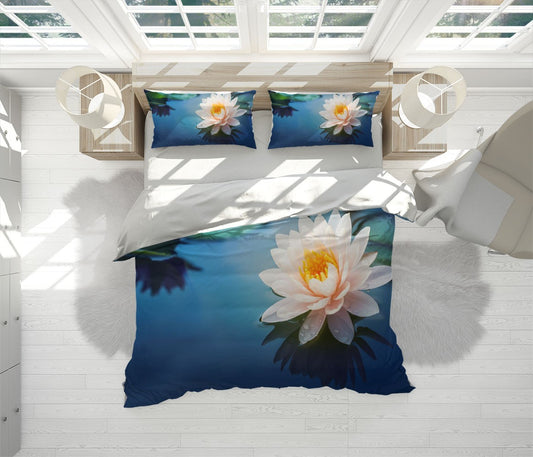 Lotus Leaf Duvet Cover Set W Pillow Cover, Blue Floral Flowers 3D Quilt Cover, Single Double Queen King Size Doona Cover