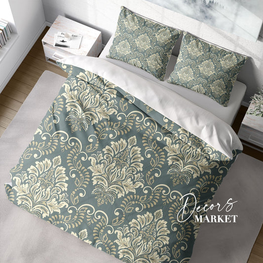 Regal Damask Duvet Cover Set w Pillowcases, Leafy Green Gray Floral Patterns 3D Quilt Cover, 3pc Single Double Queen King Size Doona Cover
