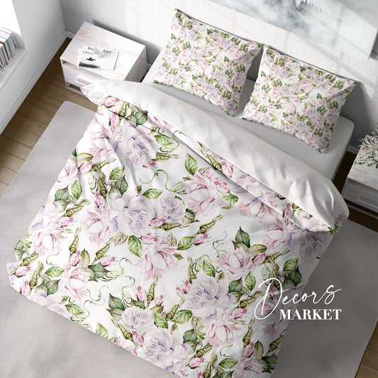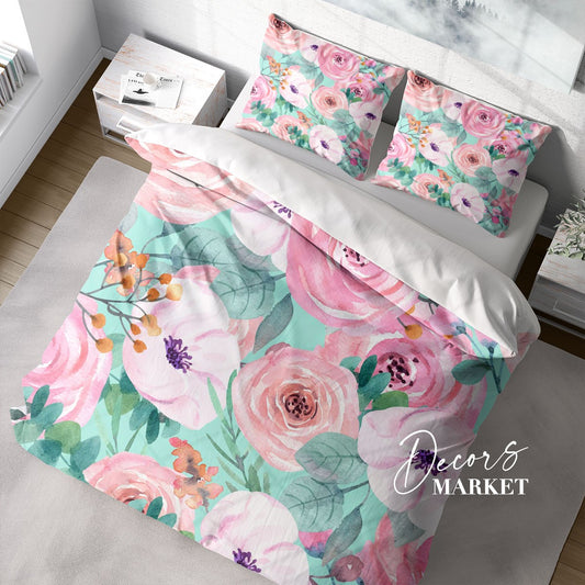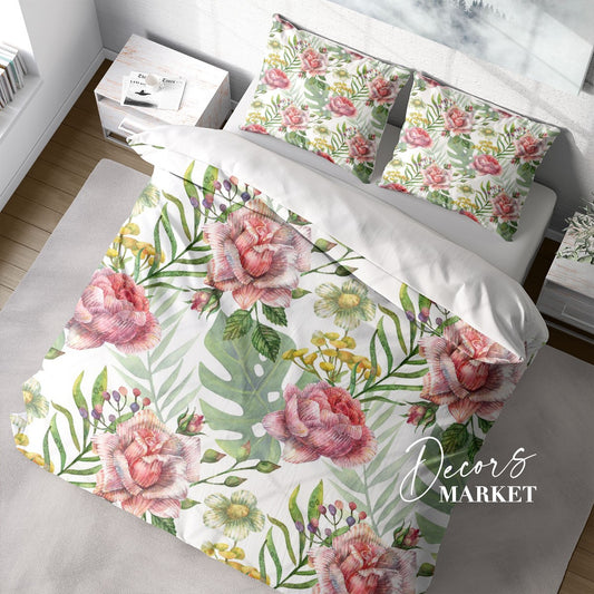 Rose Leaf Watercolor Duvet Cover Set w Pillowcases, Pink Floral Patterns 3D Quilt Cover, 3pc Single Double Queen King Size Doona Cover