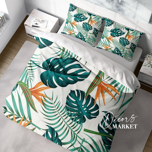Monstera Leaf Fabric Duvet Cover Set w Pillowcases, Green Floral Patterns 3D Quilt Cover, 3pc Single Double Queen King Size Doona Cover