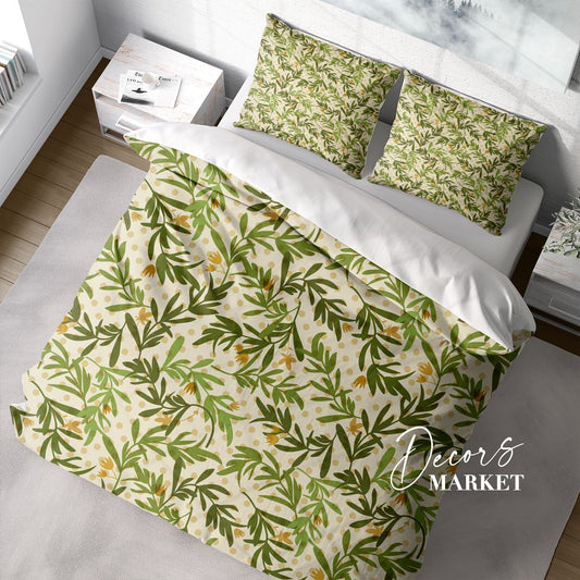 Pastel Calendula Leaf Duvet Cover Set w Pillowcases, Green Floral Patterns 3D Quilt Cover, 3pc Single Double Queen King Size Doona Cover