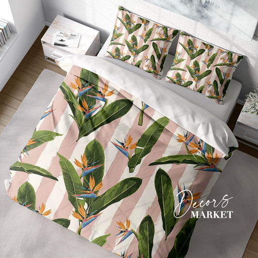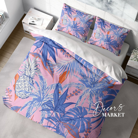 Tropical Monstera Leaf Duvet Cover Set w Pillowcases, Pink Floral Patterns 3D Quilt Cover, 3pc Single Double Queen King Size Doona Cover