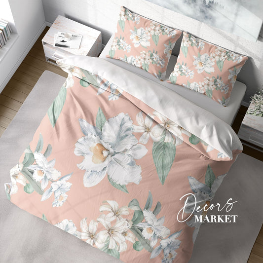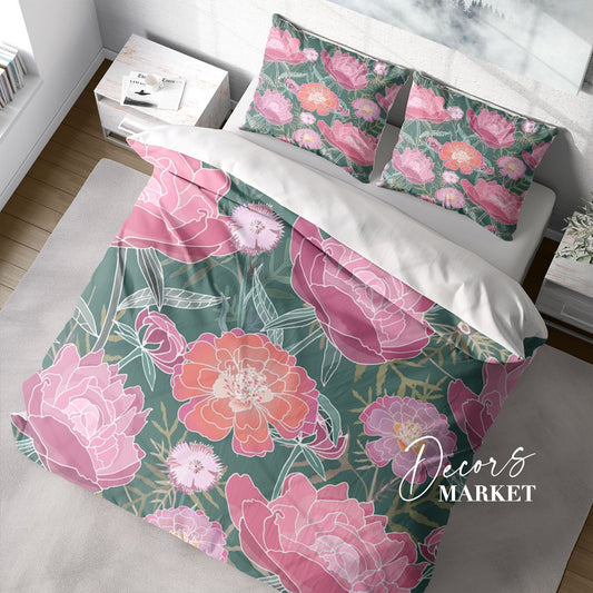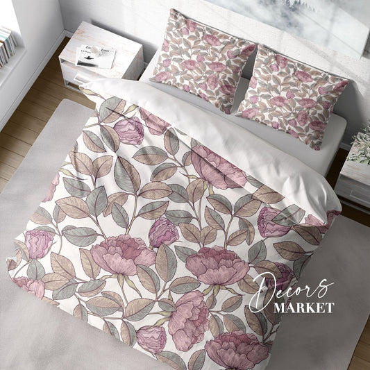 Pastel Peony Leaf Duvet Cover Set w Pillowcases, Pink Floral Patterns 3D Quilt Cover, 3pc Single Double Queen King Size Doona Cover
