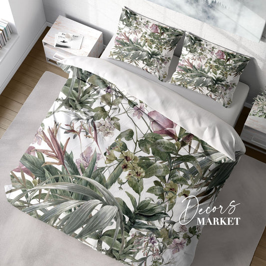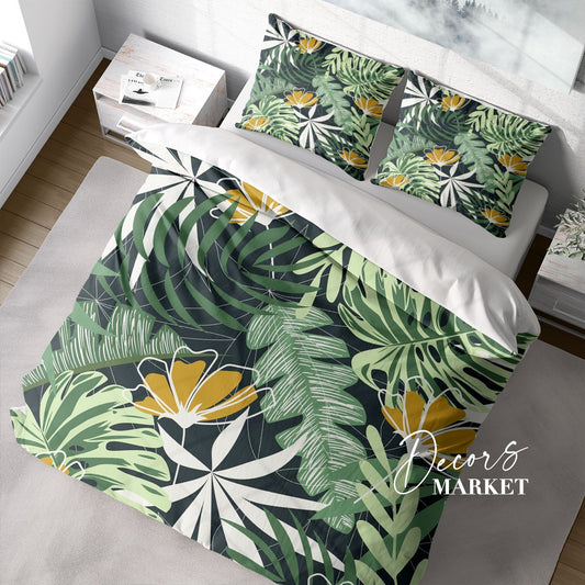 Tropical Flower Leaf Duvet Cover Set w Pillowcases, Green Floral Patterns 3D Quilt Cover, 3pc Single Double Queen King Size Doona Cover