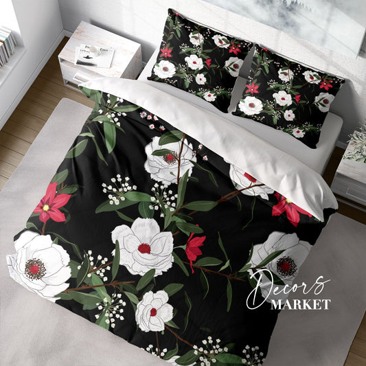 Christmas Flower Leaf Duvet Cover Set w Pillowcases, White Floral Patterns 3D Quilt Cover, 3pc Single Double Queen King Size Doona Cover