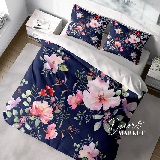 Rose Flower Leaf Duvet Cover Set w Pillowcases, Blue Berry Floral Patterns 3D Quilt Cover, 3pc Single Double Queen King Size Doona Cover