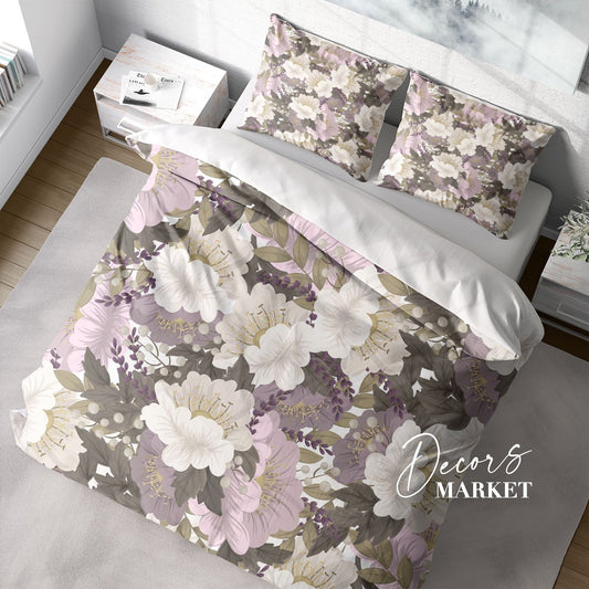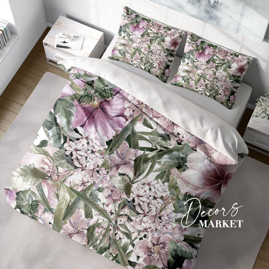 Watercolor Pastel Leaf Duvet Cover Set w Pillowcases, Purple Floral Patterns 3D Quilt Cover, 3pc Single Double Queen King Size Doona Cover
