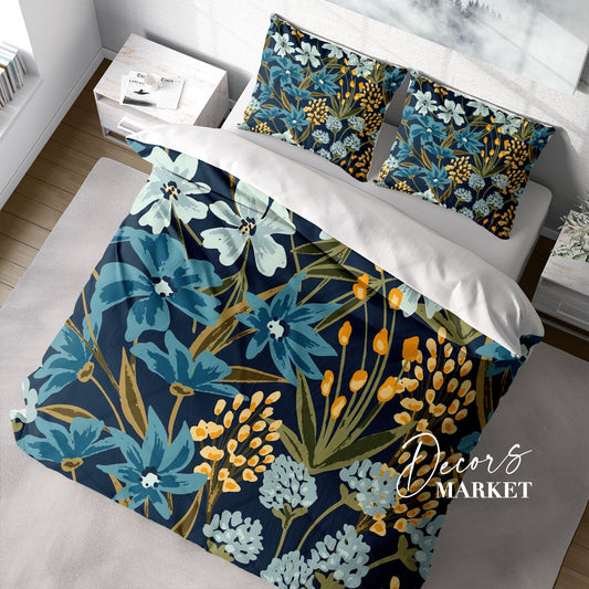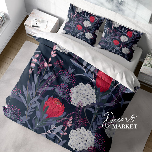 Flower at night Leafy Duvet Cover Set w Pillowcases, Blue Floral Patterns 3D Quilt Cover, 3pc Single Double Queen King Size Doona Cover