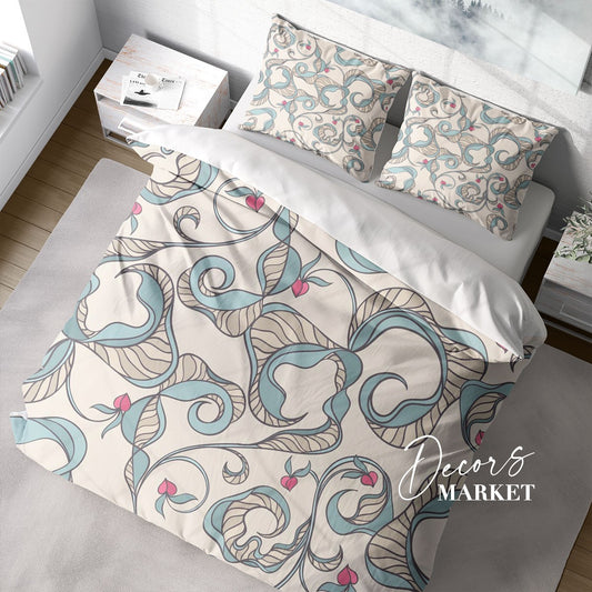 Swirl Leaf Flower Sketch Duvet Cover Set w Pillowcases, Creamy Floral Patterns 3D Quilt Cover, 3pc Single Double Queen King Size Doona Cover