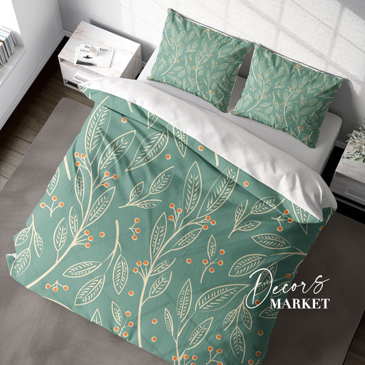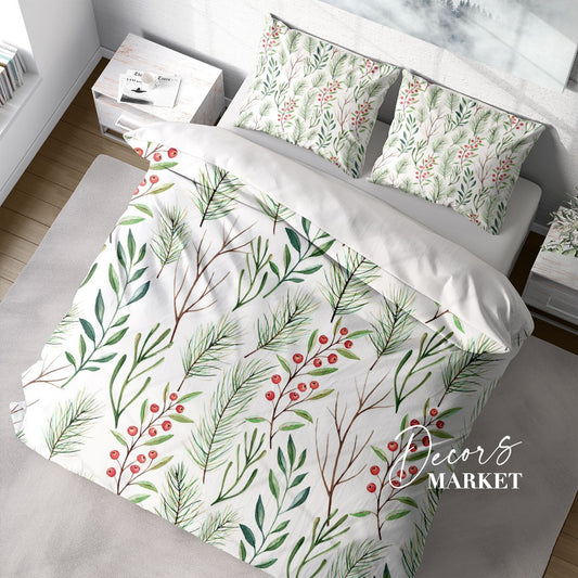 Watercolor Christmas Leaf Duvet Cover Set w Pillowcases, Green Floral Patterns 3D Quilt Cover, 3pc Single Double Queen King Size Doona Cover