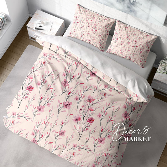 Chickweed Leaf Watercolor Duvet Cover Set w Pillowcases, Pink Floral Patterns 3D Quilt Cover, 3pc Single Double Queen King Size Doona Cover