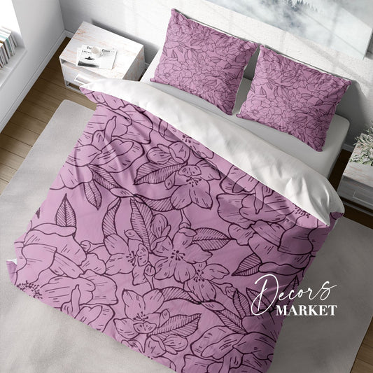Rose Leaf Sketch Line Duvet Cover Set w Pillowcases, Purple Floral Patterns 3D Quilt Cover, 3pc Single Double Queen King Size Doona Cover