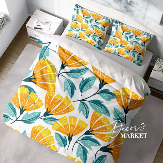 Watercolor Flower Leaf Duvet Cover Set w Pillowcases, Yellow Floral Patterns 3D Quilt Cover, 3pc Single Double Queen King Size Doona Cover