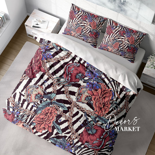 Zebra Vine Rose Leaf Duvet Cover Set w Pillowcases, Red Floral Patterns 3D Quilt Cover, 3pc Single Double Queen King Size Doona Cover
