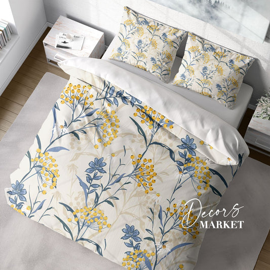 Buckthorn Leaf Flower Duvet Cover Set w Pillowcases, Yellow Floral Patterns 3D Quilt Cover, 3pc Single Double Queen King Size Doona Cover