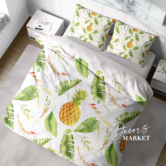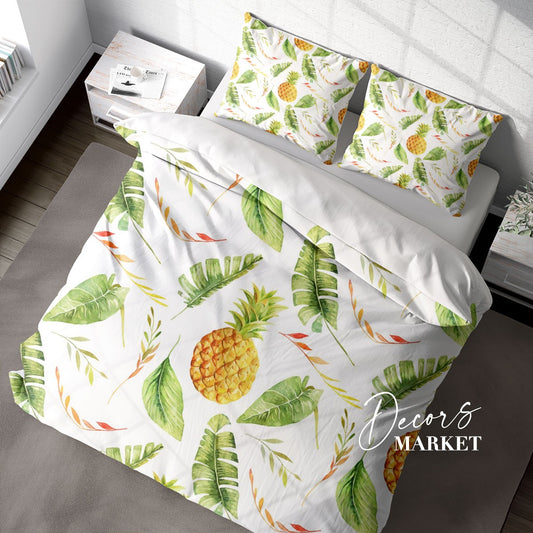 Pineapple Leaf Watercolor Duvet Cover Set w Pillowcases, Yellow Floral Pattern 3D Quilt Cover, 3pc Single Double Queen King Size Doona Cover