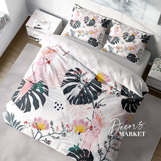 Parrot Tropical Leaf Duvet Cover Set w Pillowcases, White Floral Patterns 3D Quilt Cover, 3pc Single Double Queen King Size Doona Cover