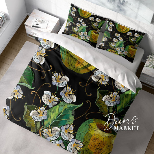 Apple Flower Leaf Art Duvet Cover Set w Pillowcases, Yellow Floral Patterns 3D Quilt Cover, 3pc Single Double Queen King Size Doona Cover