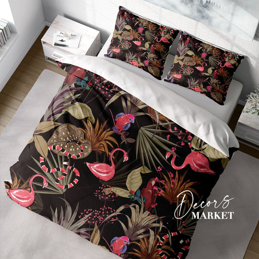 Flamingo Parrot Leaf Duvet Cover Set w Pillowcases, Black Floral Patterns 3D Quilt Cover, 3pc Single Double Queen King Size Doona Cover