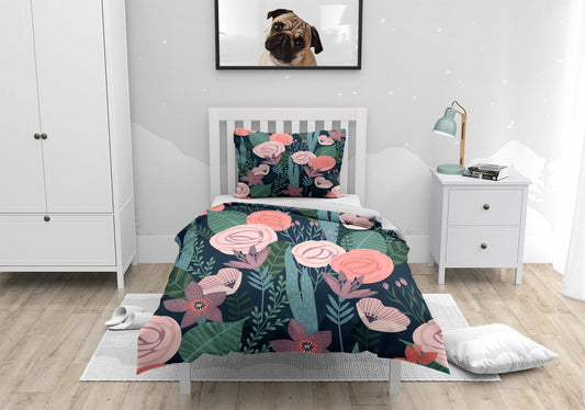 Pink Garden Rose Leaf Duvet Cover Set w Pillowcases, Blue Floral Patterns 3D Quilt Cover, 3pc Single Double Queen King Size Doona Cover