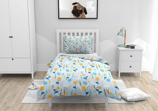 Hand Drawn Leaf and Flower Duvet Cover Set w Pillowcases, Blue Floral Patterns 3D Quilt Cover, 3pc Single Double Queen King Size Doona Cover