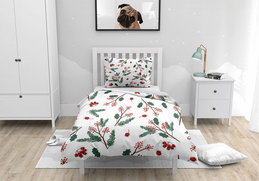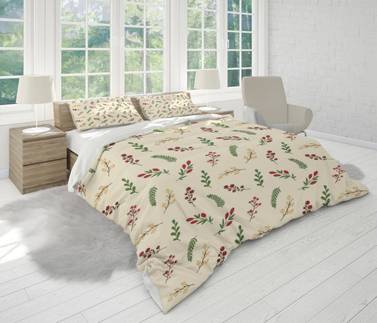 Garden Rose Leaf Duvet Cover Set w Pillowcases, Red Berries Floral Patterns 3D Quilt Cover, 3pc Single Double Queen King Size Doona Cover