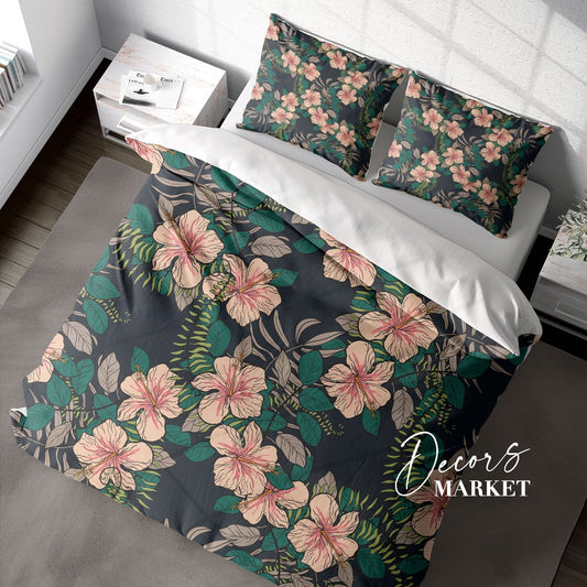 Hawaiian Hibiscus Leaf Duvet Cover Set w Pillowcases, Green Floral Patterns 3D Quilt Cover, 3pc Single Double Queen King Size Doona Cover