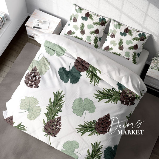 Pine Cones Leaf Duvet Cover Set w Pillowcases, Green Floral Patterns 3D Quilt Cover, 3pc Single Double Queen King Size Doona Cover