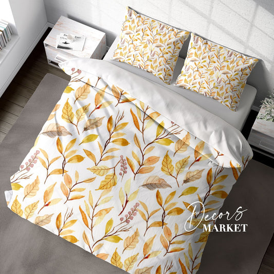 Golden Leaf Duvet Cover Set w Pillowcases, Yellow Floral Patterns 3D Quilt Cover, 3pc Single Double Queen King Size Doona Cover