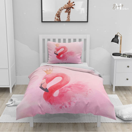 Crown Watercolor Flamingo Duvet Cover Set w Pillow Cover, Pink Kids Animal 3D Quilt Cover, Single Double Queen King Size Doona Cover