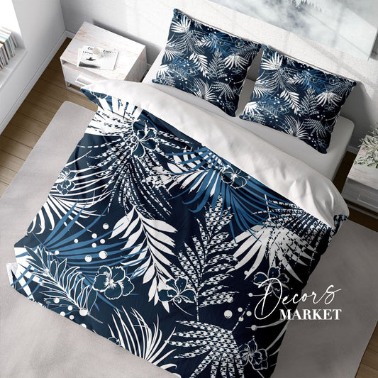Tropical Leaves Duvet Cover Set w Pillowcases, Blue Floral Patterns 3D Quilt Cover, 3pc Single Double Queen King Size Doona Cover