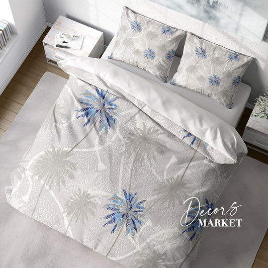 Coconut Tree Duvet Cover Set w Pillowcases, Blue Tropical Floral Leaves 3D Quilt Cover, 3pc Single Double Queen King Size Doona Cover