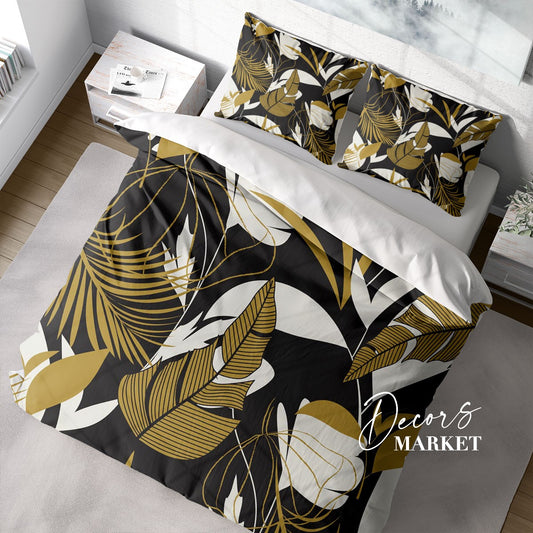 Banana Leaves Duvet Cover Set w Pillowcases, Black bg Tropical Floral Leaves 3D Quilt Cover, 3pc Single Double Queen King Size Doona Cover