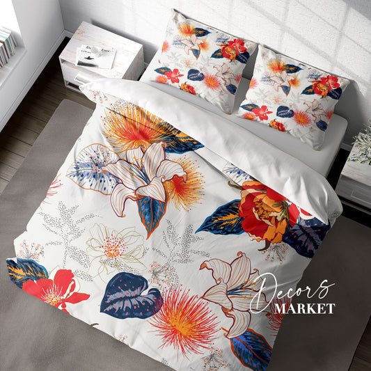 Tropical Hibiscus Frangipani Duvet Cover Set w Pillowcases, Blue Floral Patterns 3D Quilt Cover, Single Double Queen King Size Doona Cover